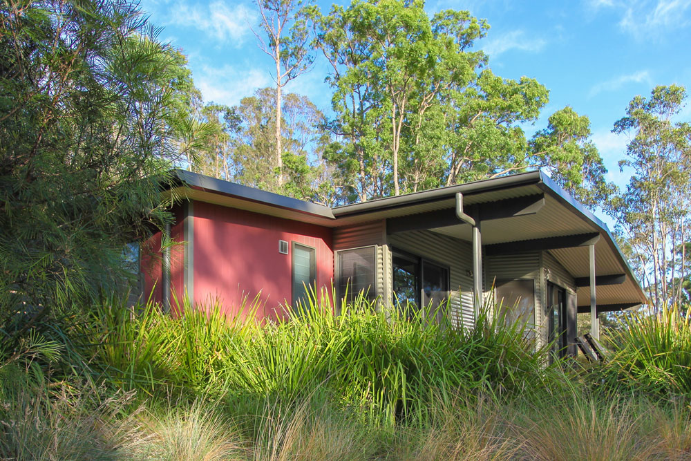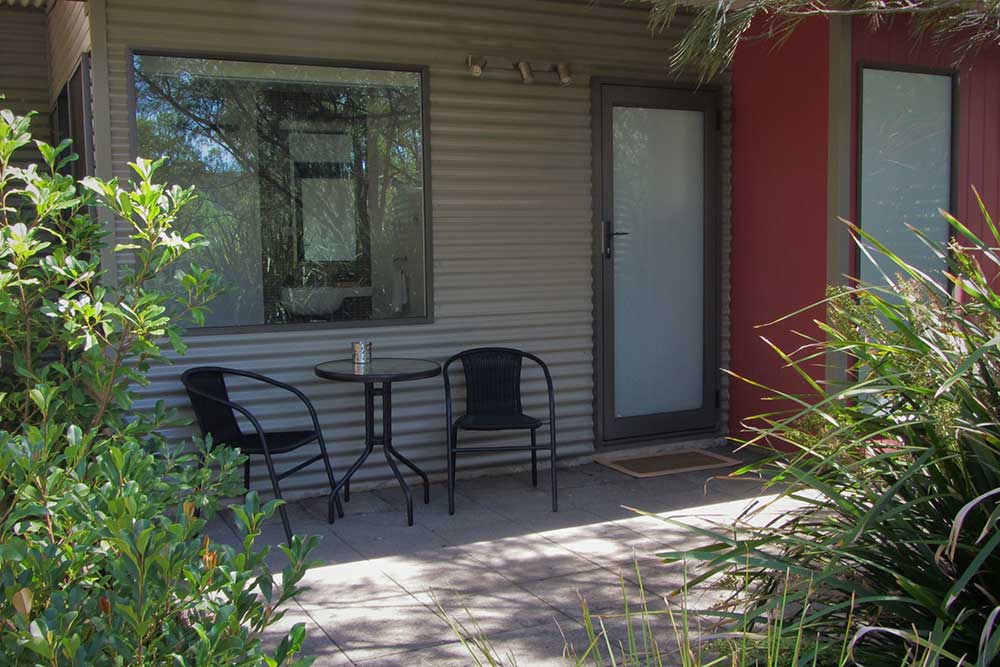 Both our couples retreats offer the same high quality fittings and furnishings, and have the same layout. They are a one-bedroom retreat with bed separate to the living area, not a studio room. The retreats are decorated in different colour schemes, and have slightly different outlooks – Lowanna Retreat is furnished in greens and charcoals, with natural bamboo flooring, enjoys a northerly aspect, and is nestled below a spectacular rocky outcrop with valley views.